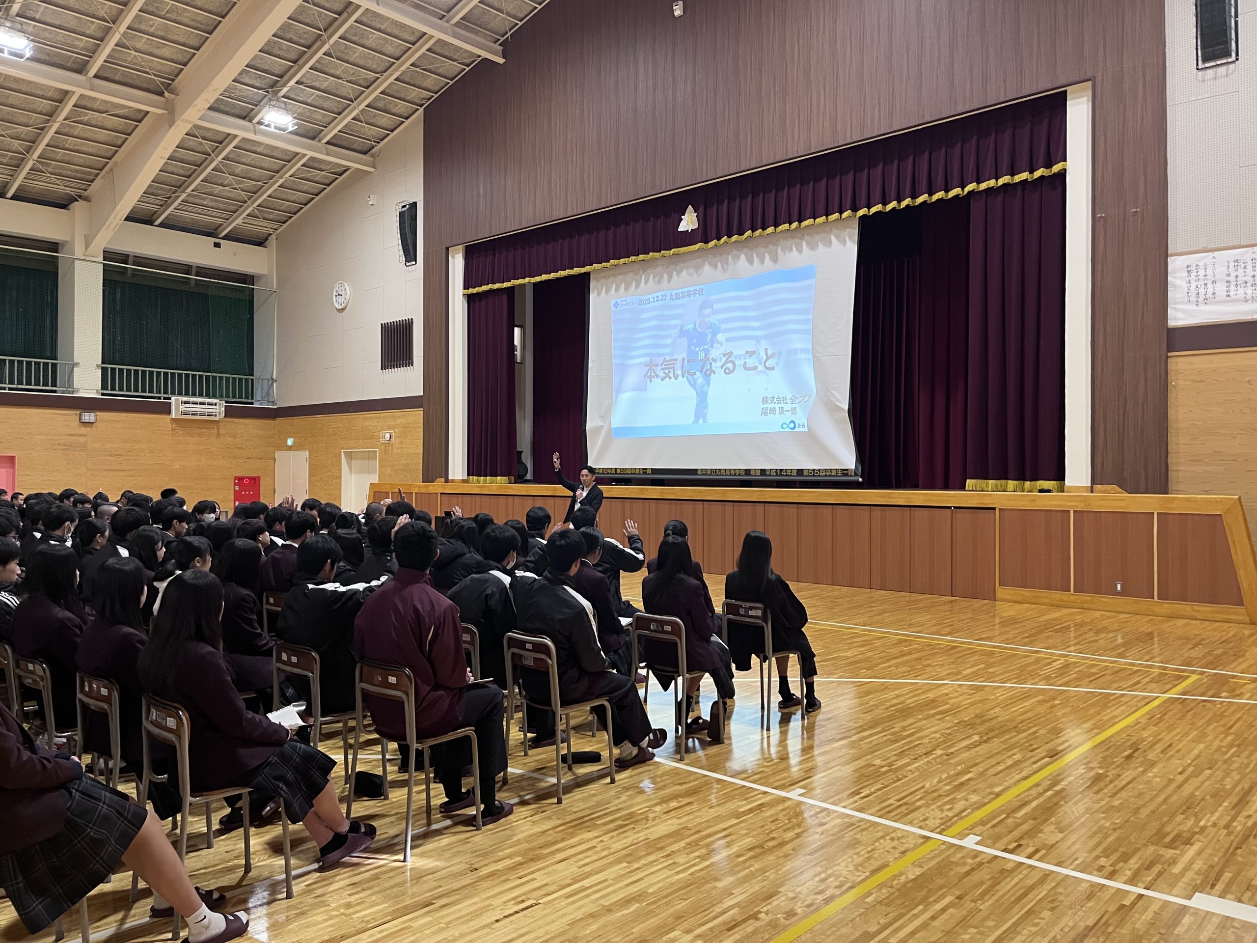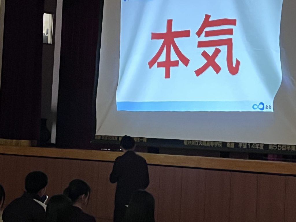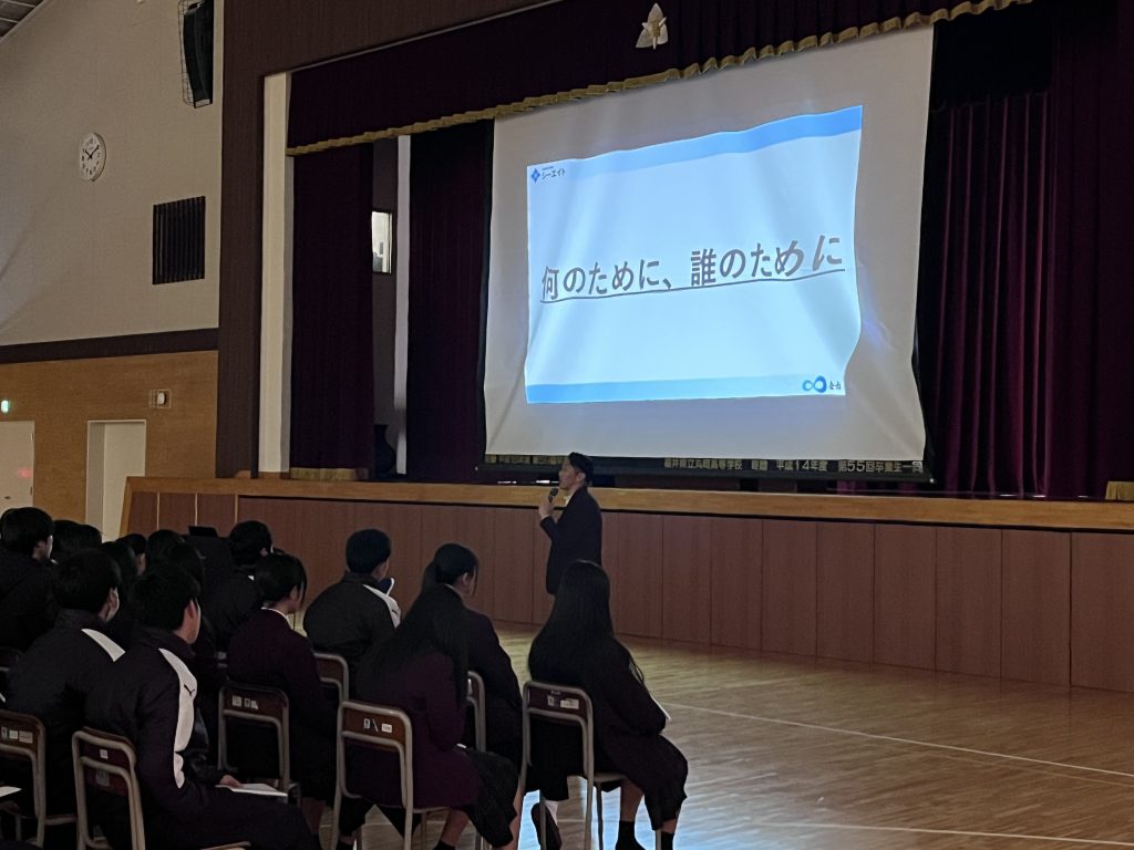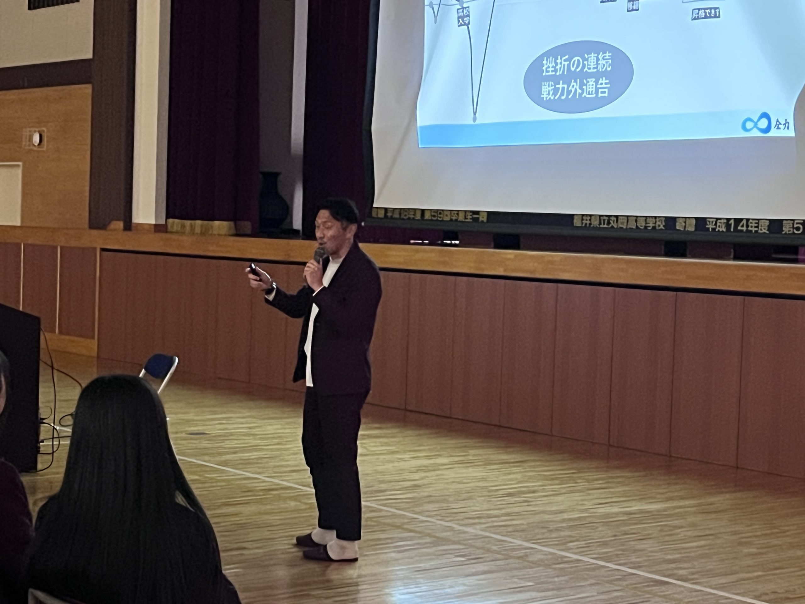 丸岡高校は起業家をお迎えし、起業家精神を学ぶアントレプレナーシップ教育を推進しています。12月23日は学校設定教科「みらい」として、株式会社全力から尾崎瑛一郎社長をお迎えして、ご講演をいただきました。