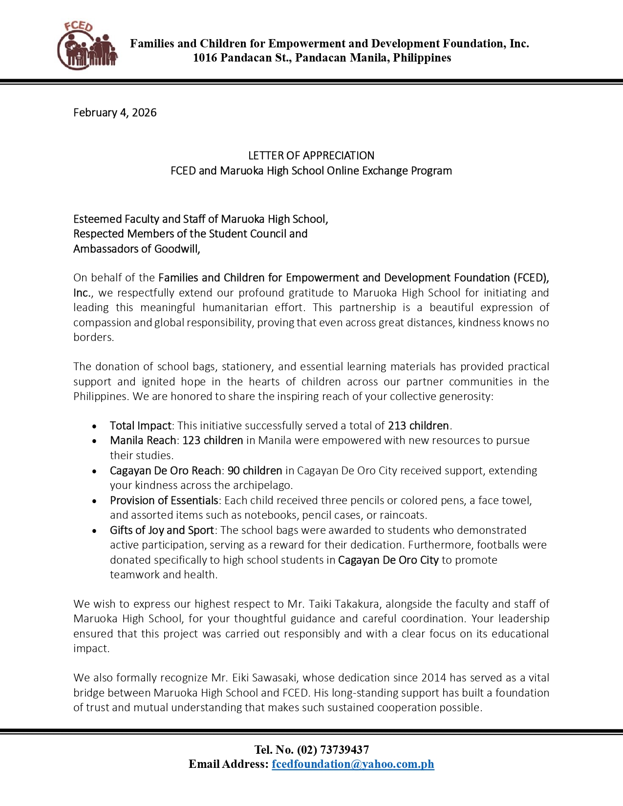 On behalf of the Foundation for Community Education Development (FCED), we would like to formally express our deepest appreciation to Maruoka High School for your invaluable support and meaningful collaboration with the FCED exchange program. The initiative of collecting unused stationery for the benefit of the children in the Philippines is a profound act of compassion and global responsibility. This program does not only provide much needed educational materials, it also delivers hope, encouragement, and a powerful message to Filipino children that they are remembered, valued, and supported by friends beyond borders. Your generosity directly contributes to improving access to education and nurturing a sense of dignity and motivation among our beneficiaries.