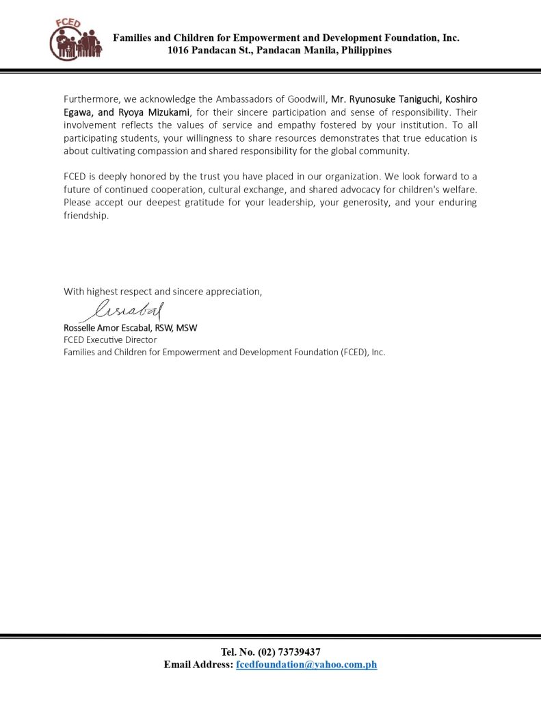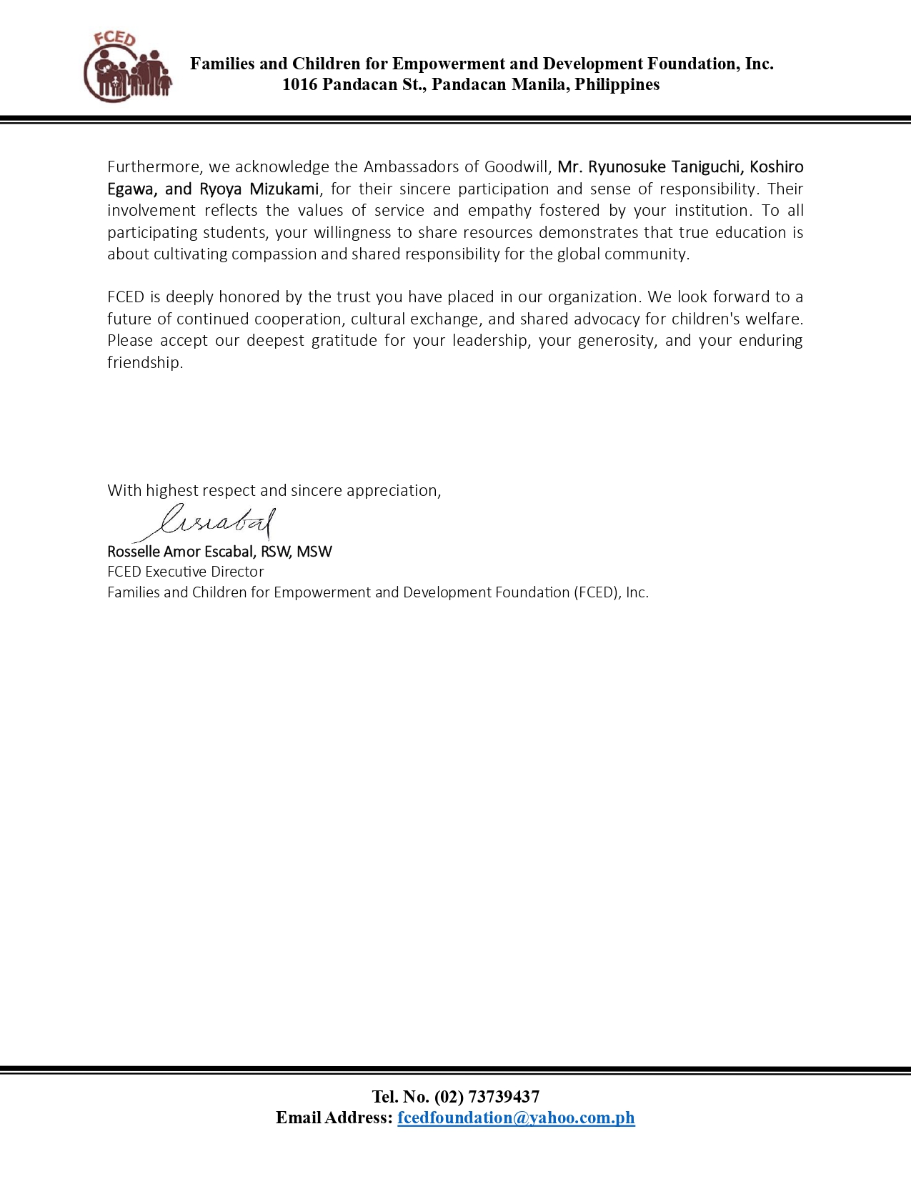 FCEDは、皆様が当団体に寄せられた信頼に深く感謝しております。今後も継続的な協力関係、文化交流、そして児童福祉のための共同提言を推進してまいります。皆様のリーダーシップ、寛大なご支援、そして変わらぬ友情に対し、心より御礼申し上げます。