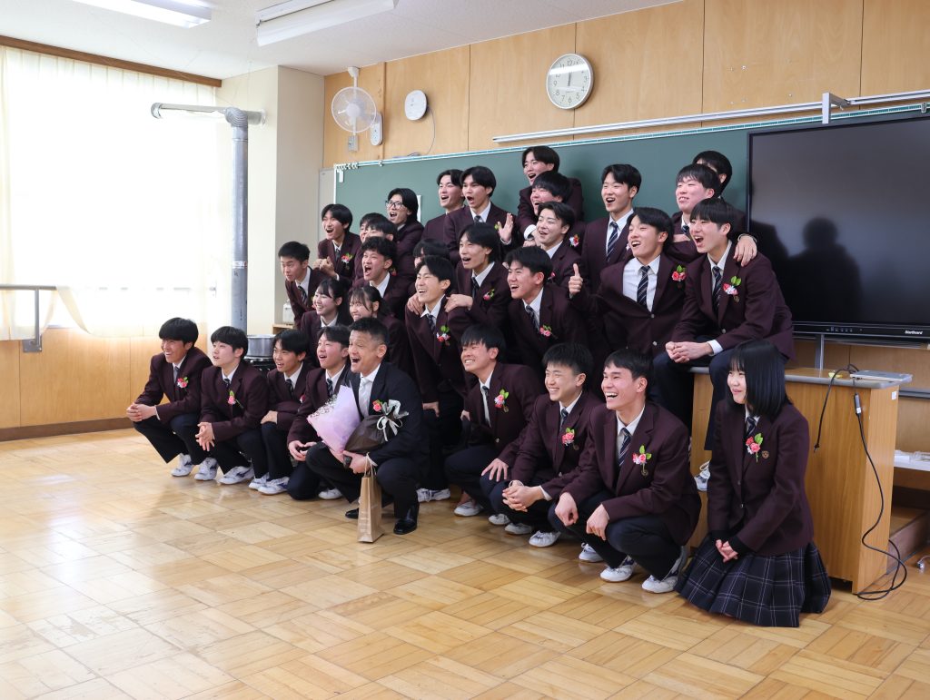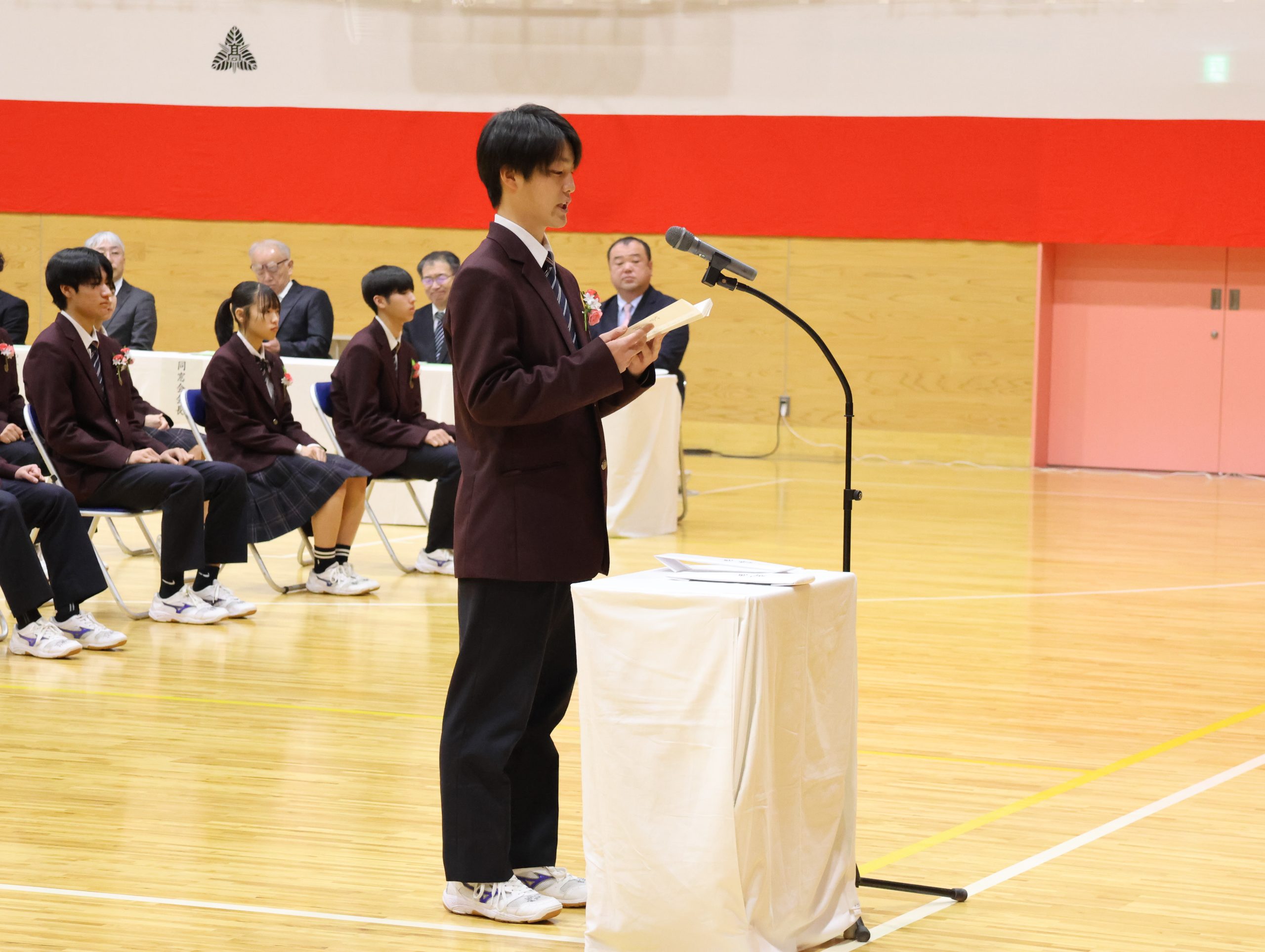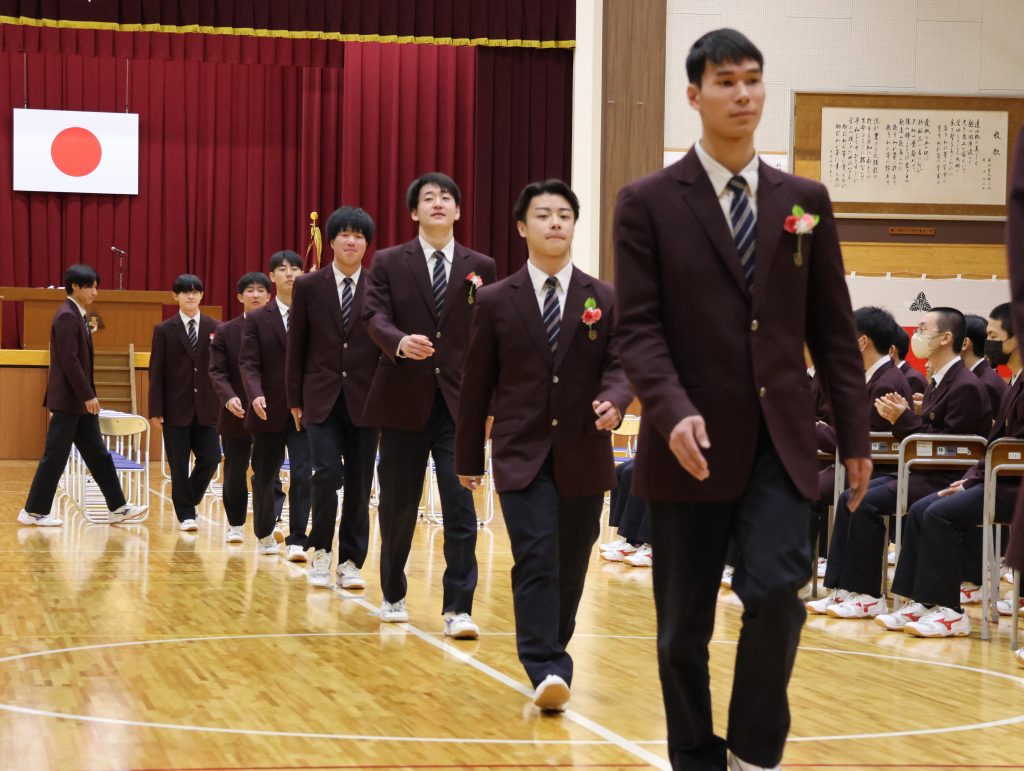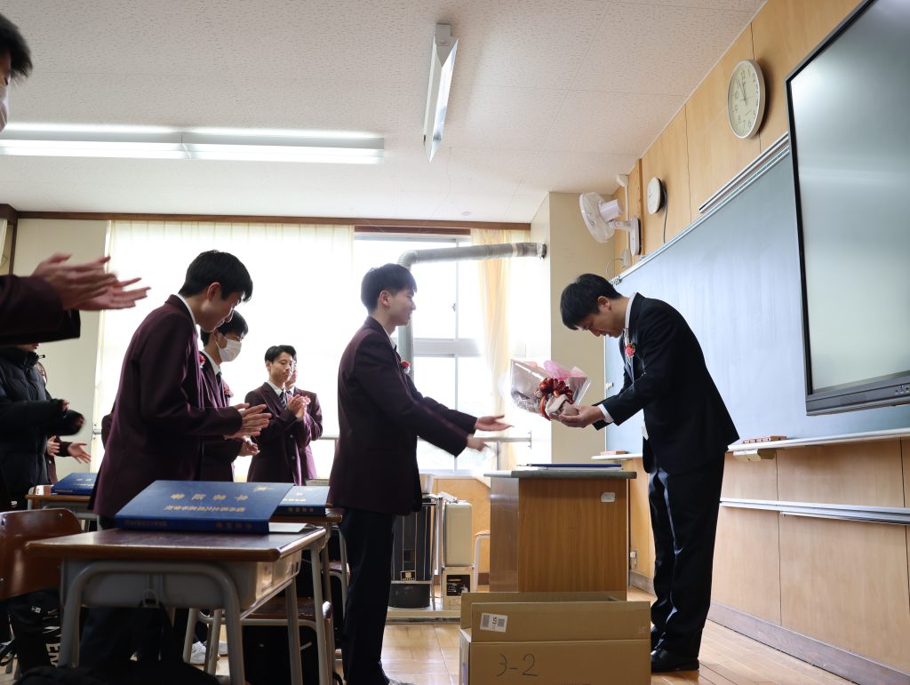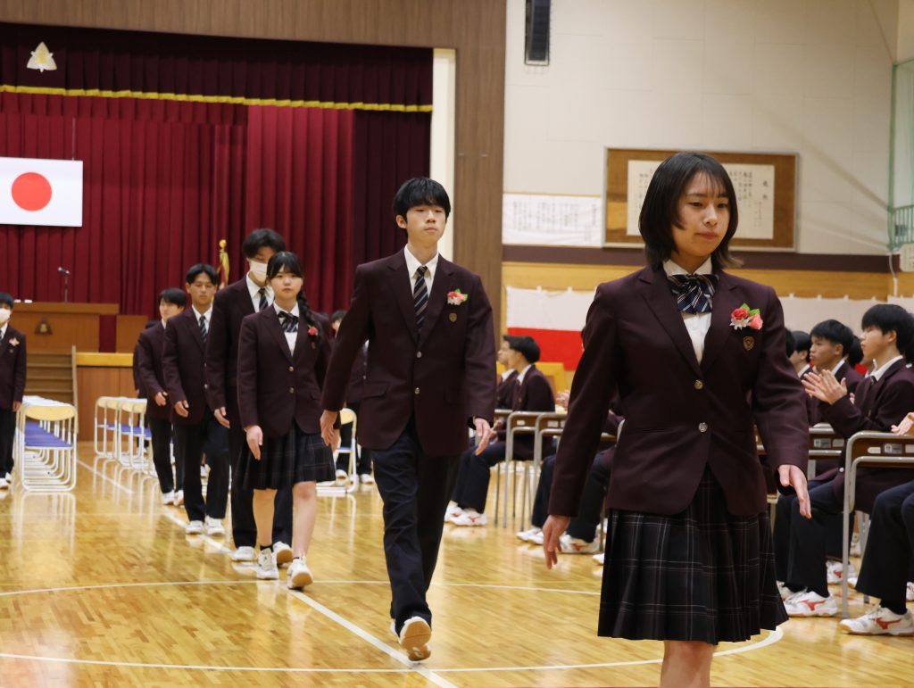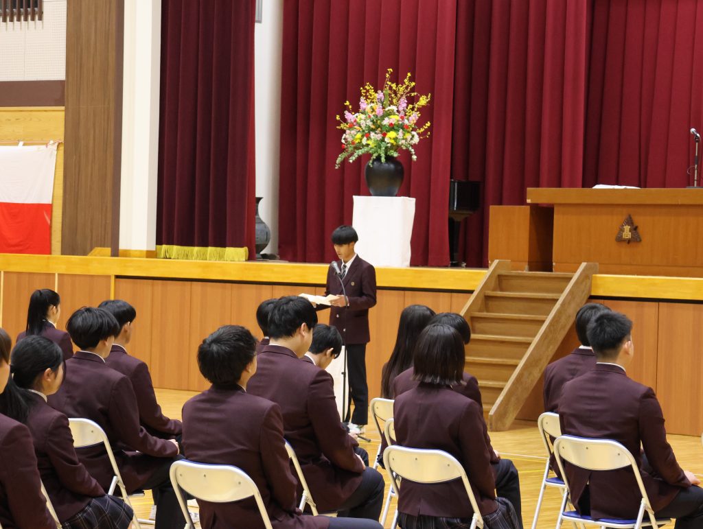 在校生代表の生徒会長西村君による送辞では、「後輩を力強く引っ張ってくださった姿から、多くのことを学びました。伝統や思い、責任をしっかり引き継いで、1つ1つのことに真剣に向き合っていきます。」と、感謝と決意の言葉が送られました。